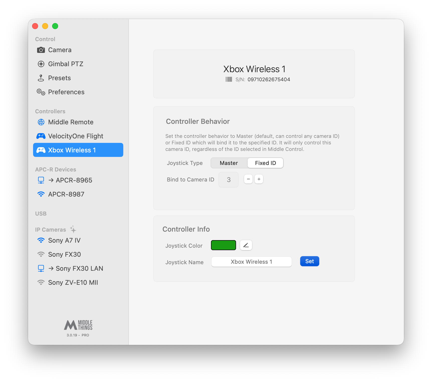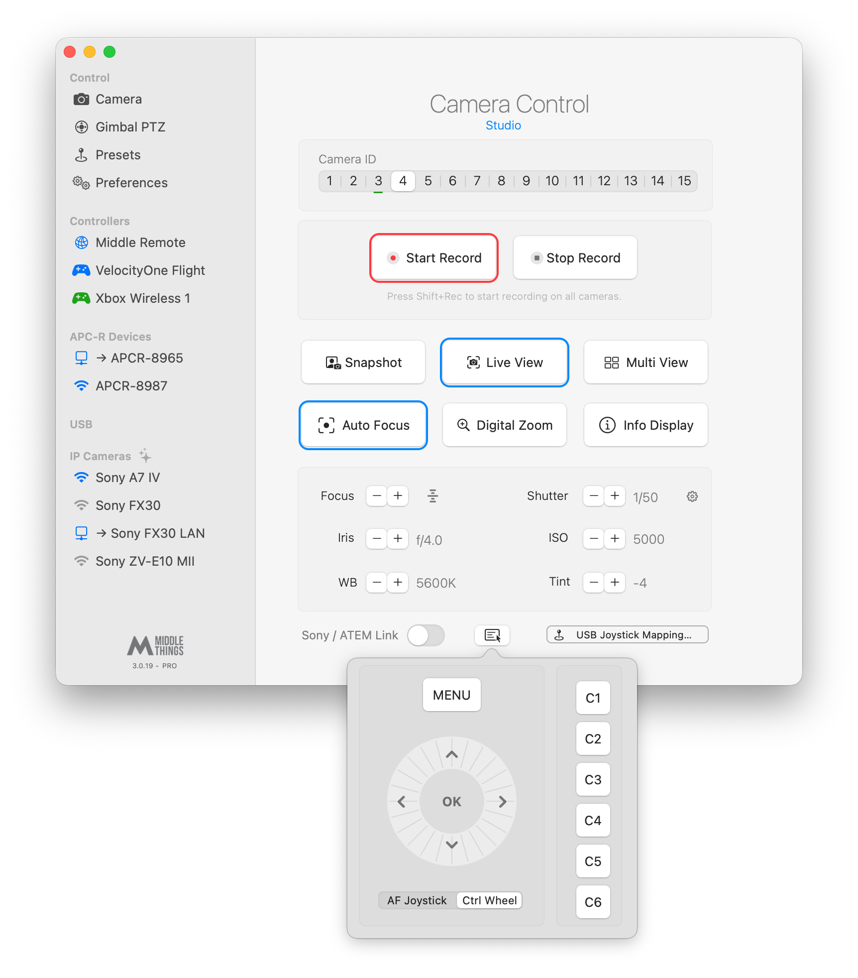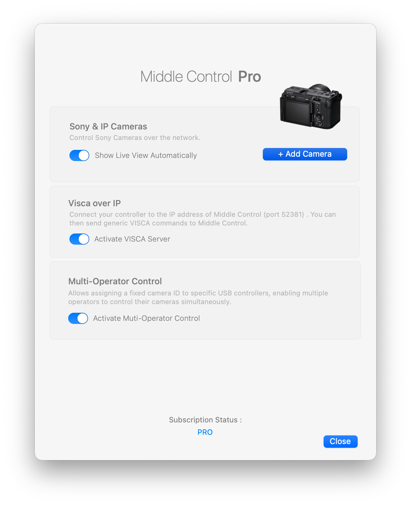 Built for advanced live environments, Middle Control 3 Pro unlocks Sony Camera Control, Live View and Multi View, remote menu control, VISCA over IP, multi-operator control, and future 3.x pro updates.